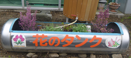 廃品の雨水タンクを花だんとしてもう1度活躍